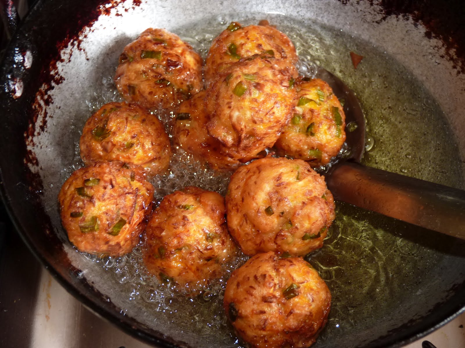 Now, prepare little balls (smaller than a lemon), and deep fry them on medium flame until golden brown. Keep aside.
